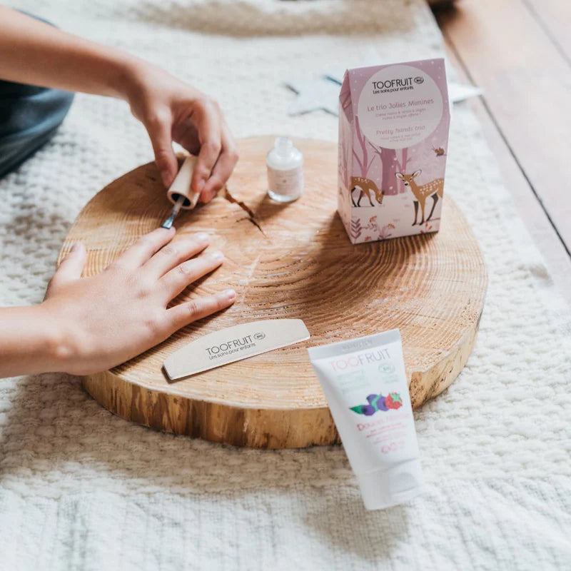 Sur notre e-shop, vous retrouverez leur dissolvant doux, le vernis fraise, le vernis pêche, ainsi que le trio pour les mains, parfaits pour découvrir tout l’univers fruité et ludique de Toofruit.